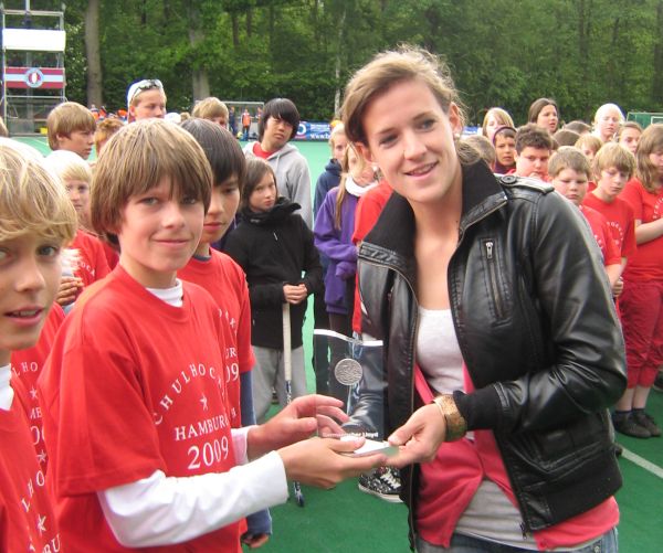 Die Siegerehrung fand dann nach dem Länderspiel Australien gegen England vor einigen hundert interessierten Zuschauern auf der Anlage vom UHC statt. Der Schulhockeyreferent des DHB, Michael Wallroth, bedankte sich beim Hamburger Hockey Verband für die vorzügliche Ausrichtung dieses Turniers und bei den Sponsoren, dem Verein „Freunde des Hockeys“, der allen Teilnehmern ein speziell für das Turnier angefertigtes T-Shirt als Erinnerung spendiert hat, und dem Germanischen Loyd, der die Siegerpokale stiftete und dieses Turnier auch finanziell unterstützte.