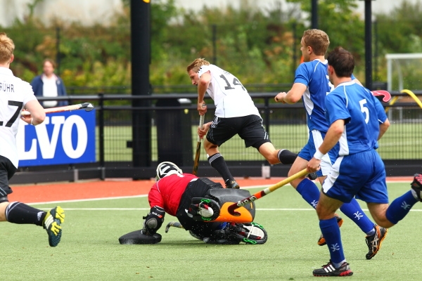 26.08.2012 - Die deutschen U21-Herren sind exzellent in die Europameisterschaft im niederländischen s'Hertogenbosch gestartet. Das Team von Bundestrainer Jamilon Mülders besiegte Schottland in einer einseitigen Partie auch in der Höhe verdient mit 6:1 (3:0) und übernahm die Tabellenführung vor dem nächsten Gruppengegner Belgien (Di., 17 Uhr), der ebenfalls mit einer starken Vorstellung Spanien 4:0 bezwang. Die deutschen Tore schossen Mats Grambusch, Benedikt Swiatek, Danny Nguyen, Christopher Rühr, Anton Ebeling und Niklas Wellen.