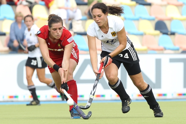 Bei fast tropischen Temperaturen auf dem Wormser Kunstrasen gehörten die Startminuten den furios beginneneden Gästen, die zwei Chancen hatten und Torfrau Yvonne Frank auch gleich einmal prüften. Nach einer Viertelstunde übernahmen die Deutschen jedoch das Ruder. Es liefen etliche Angriffe auf das belgische Tor, vor allem durch die überragende Rekord-Nationalspielerin Natascha Keller immer wieder angetrieben. Maike Stöckel hatte zwei Großchancen. Dann jubelten die Deutschen in der 21. Minute als Jennifer Plass auf Vorarbeit von Marie Mävers traf, doch das Tor fand keine Anerkennung.