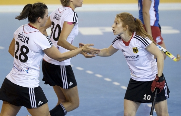 24.01.2014 - Die deutschen Damen sind bei der Hallenhockey-Europameisterschaft in Prag mit einem 10:0-Kantersieg (3:0) gegen die tschechischen Gastgeberinnen gestartet. Sechs verschiedene Schützinnen konnten sich für das DHB-Team auf das Scoreboard bringen. Die Deutschen übernahmen damit die Tabellenführung vor dem nächsten Gruppengegner Niederlande (heute, 17.50 Uhr), der sein Auftakt-Match gegen England mit 7:0 gewann.
